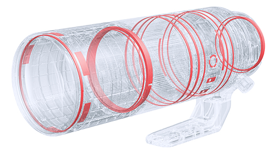 三脚座の位置は、ズーム全域でシャッターショックによるブレが発生しにくくなるよう、シミュレーションや実験を繰り返し設計しています。またLレンズと同様にマウント部やスイッチ部、ボタン部、フォーカス/コントロールリング、ズームリング、調整リングに防塵・防滴構造※を採用しました。
