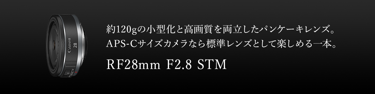 質量約120gのRFレンズ初のパンケーキレンズ。フルサイズユーザーには、使い勝手のよい広角28mm、APS-Cサイズユーザーには、自然な画角の35mm換算45mm相当の標準レンズとしてご使用いただけます。単焦点レンズならではの明るいレンズで、キットの標準ズームレンズでは撮ることが難しい背景や点光源をキレイにぼかした写真を手軽かつ高画質に表現できます。