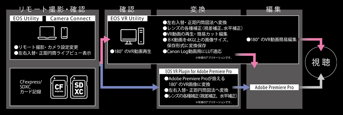 VR動画撮影時のみならず編集までを手軽に。リモート撮影、再生、変換に対応する各種ツールで、ハイクオリティーな映像制作を目指すクリエーターをサポートします。