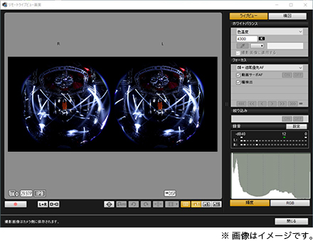 「EOS Utility」は有線・無線接続でPCからのリモート撮影に対応。ライブビュー撮影で[円周魚眼/正距円筒][左/右]を切り替えて表示することが可能です。「Camera Connect」は、スマートフォンやタブレットとWi-Fi接続し、リモート撮影が可能。屋外での撮影に便利です。