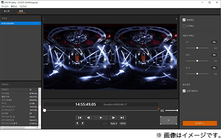 レンズの構造上左右逆に記録されている魚眼画像の左右入替や、正距円筒図法への変換(動画・静止画に対応)、レンズの各種補正対応(視差補正、水平補正)、再生・簡易カット編集が行えます。また、8K動画の4K以上の画像サイズ、保存形式への変換や、Canon Log動画用のルックアップテーブルにも対応しています。