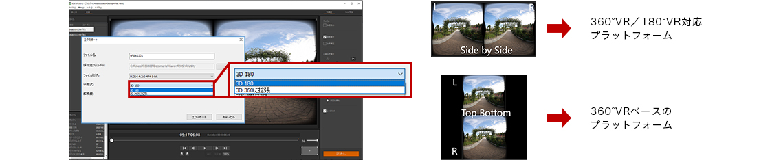多様なVRプラットホームへの対応として、従来の180°VR形式に加え、新たに360°VR形式(180°VR in 360°VR)でも視聴できるようになりました。また、「Side by Side」方式以外にも、「Top Bottom」方式の360°VRベースのNLEによるVR編集も扱うことが可能です。