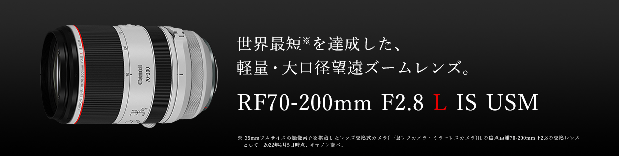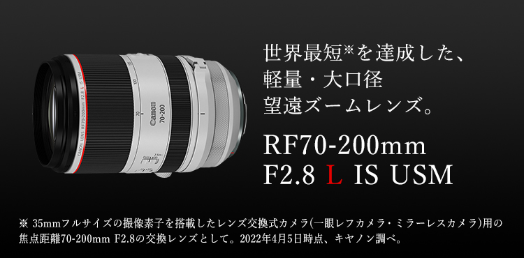 35mmフルサイズの撮像素子を搭載したレンズ交換式カメラ(一眼レフカメラ・ミラーレスカメラ)用の焦点距離70-200mm F2.8の交換レンズとして。2022年4月5日時点。キヤノン調べ。