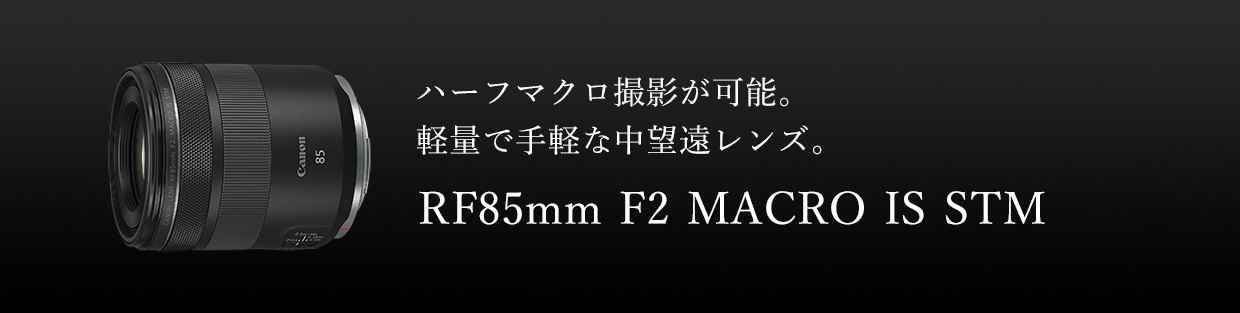 “RF85mm F2 MACRO IS STM”は、小型・軽量設計の中望遠単焦点レンズです。開放F値F2という明るさで、ボケ味を生かしたポートレート撮影やマクロ撮影が可能です。