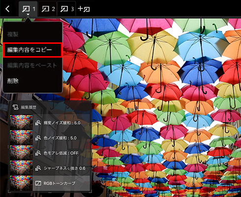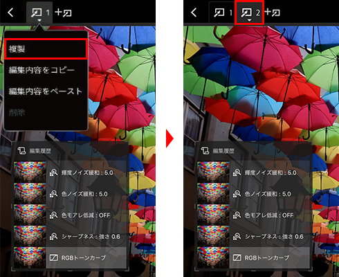 タップするとメニューが表示されます。複製は、同一画像内に編集履歴をつくることが可能です。さまざまな調整効果を比較しながら、画づくりが行えます。