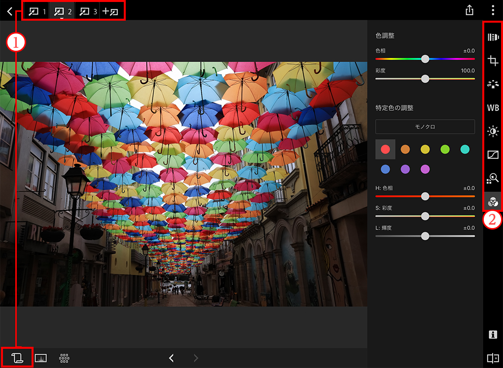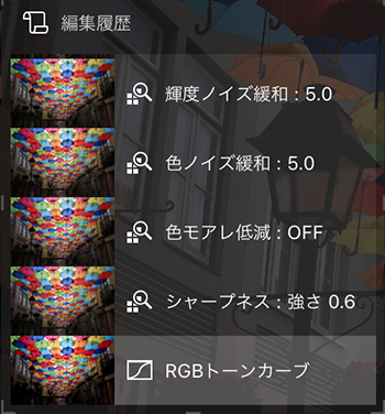 編集効果の比較に便利な機能です。複数作成して、結果を見比べながら画づくりが行えます。タップすることで、編集履歴の表示/非表示の切り替えが選択可能です。