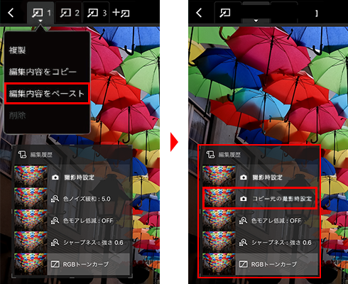 編集履歴をコピーして、別の画像にペーストが可能。複数の画像間の調整を効率的に行うことができます。ペーストすると、それまでの編集内容は上書きされます。