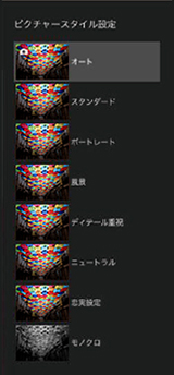 タッチするだけで、ピクチャースタイルを変更可能。撮影時のピクチャースタイルは左上にカメラマークが表示されます。