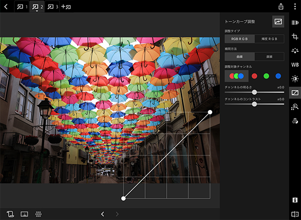 トーンカーブの任意の場所をスワイプすると、編集ポイントの追加と移動が可能です。調整したトーンカーブの編集ポイントは、ダブルタップすることで削除できます。