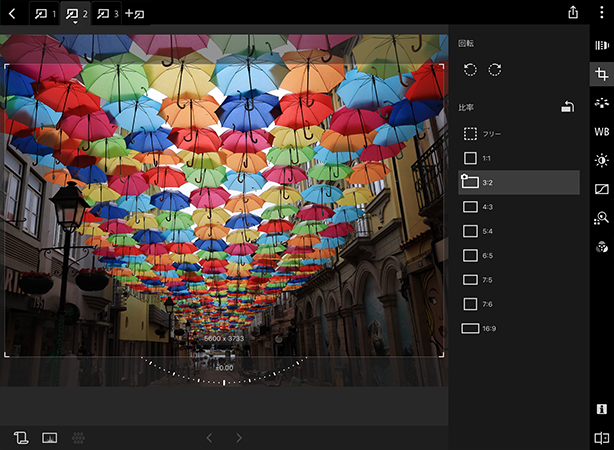 スワイプ操作で任意のトリミングが行えます。90°単位の回転や比率の変更などもタッチ操作で行えます。