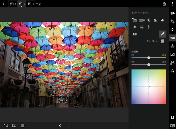 タップまたはドラッグで微調整を行うことができます。また、スポイトをタップすると、ターゲットが表示。ターゲットの外枠をスワイプすることで、白の基準を選択することができます。