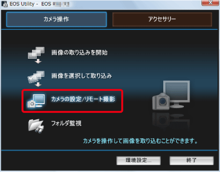 5. 下図が表示されたら、[カメラの設定/リモート撮影]をクリックします。