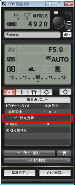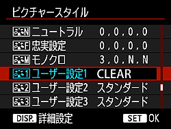 EOS Utilityで登録したピクチャースタイルファイルが、[ユーザー設定1]に表示されていることを確認できます。