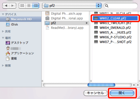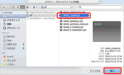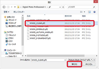 8. [ファイルを開く]ダイアログボックスが表示されたら、パソコンに保存されているピクチャースタイルファイル(拡張子「.pf2」)を選択し、[開く]をクリックします。