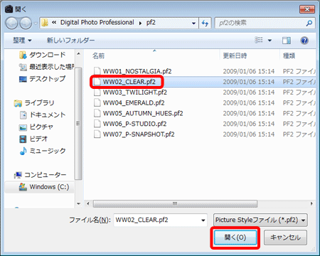 5.「ファイルを開く」ダイアログボックスが表示されるので、適用したいピクチャースタイルファイルを選択し、「開く」をクリックします。