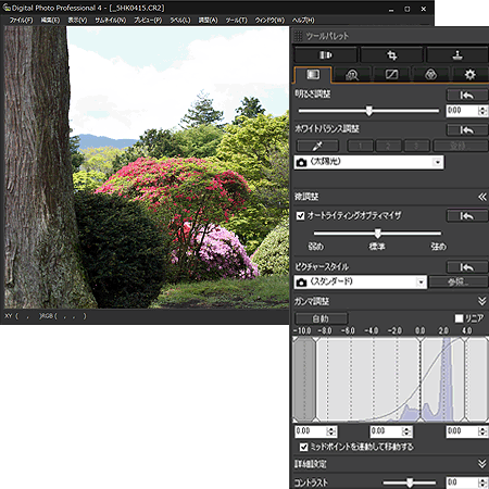 3. メイン画面でピクチャースタイルファイルを適用するRAW画像をダブルクリックすると、編集画面とツールパレットが表示されます。
