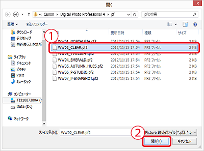 5.「ファイルを開く」ダイアログボックスが表示されるので、適用したいピクチャースタイルファイルを選択し、②「開く」をクリックします。