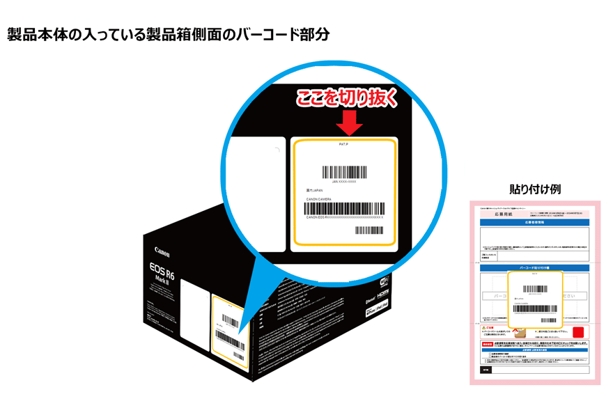 印刷した用紙に、製品箱のバーコード部分すべての切り抜きを貼って郵送してください。