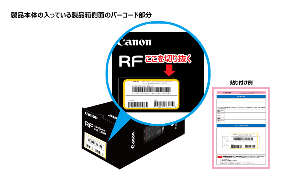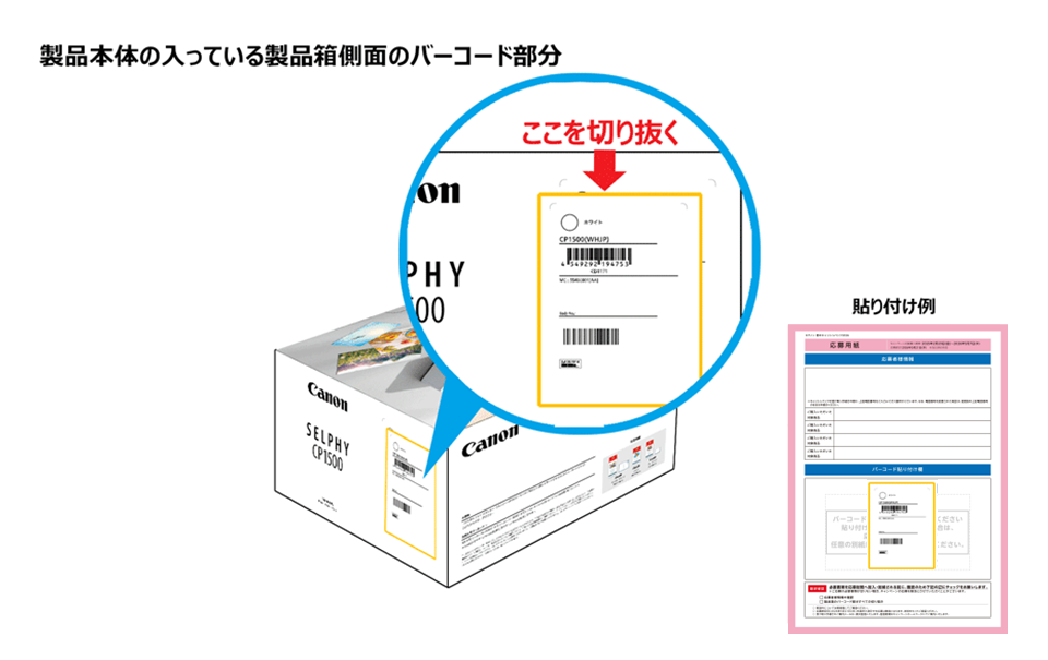 印刷した用紙に、製品箱のバーコード部分すべての切り抜きを貼って郵送してください。