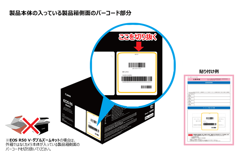 ただし、EOS R50 V・ダブルズームキット(ホワイト)、EOS R50 V・RF-S14-30 IS STM PZレンズキット(ホワイト)は、キャンペーン開始日までのご予約分もキャッシュバック対象となります。