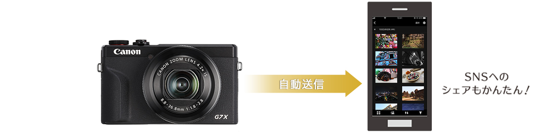 撮影しながらペアリングしたスマホやタブレットへ画像を自動で送信可能。撮影現場でのチェックはもちろん、SNSでのシェアもかんたんです。撮影後、あらためて画像を保存する必要がありません。自動送信は[する/しない]、画像サイズは[縮小/オリジナル]から選択できます。