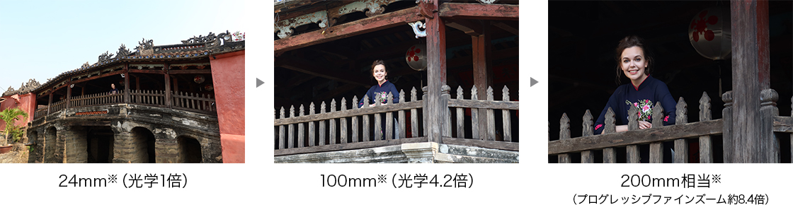 24-100mm※(光学4.2倍ズーム)の幅広い撮影領域を実現。広角から望遠まで高画質に記録します。さらに、プログレッシブファインズームにより解像感を維持しながら、200mm相当(約8.4倍)までズーム撮影が可能です。