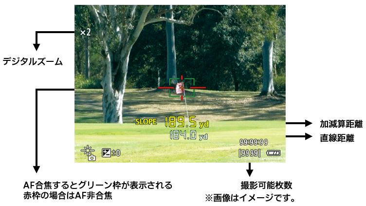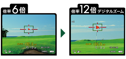 また、ファインダー内の倍率を6倍/12倍(デジタルズーム)にボタン一つで切り替えできるため、遠くのピンフラッグも捉えやすくなります。