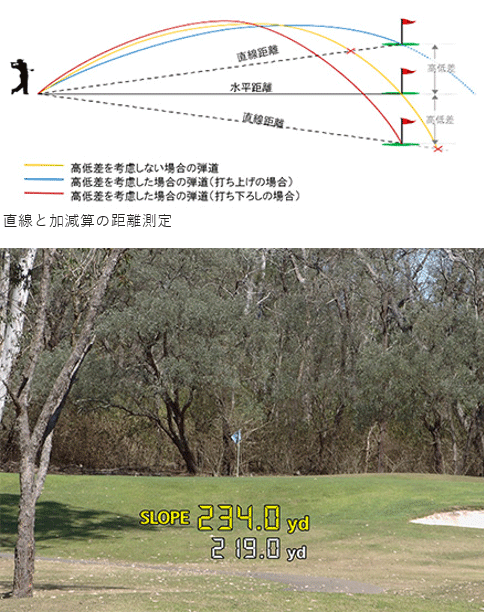 直線距離の測定のほか、コースの勾配を配慮した実際に打つべき距離である加減算距離(水平距離±高さ)を測定可能。距離感のつかみにくい起伏のあるコースでもゴルフクラブの選択がスムーズに行えます。