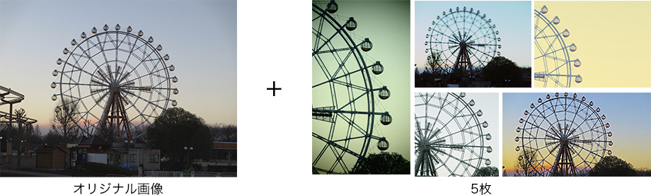 新しい写真を撮る条件は「アングル」「構図」「色、光」。この3つを変えると、写真は劇的に変わります。このうち、「構図」「色、光」をカメラが自動で変えて6種類の写真(オリジナル画像を含む)を一度に撮影できるのが「クリエイティブショット」。思いもよらなかった個性的な写真や印象的な写真を、かんたんに撮ることができます。