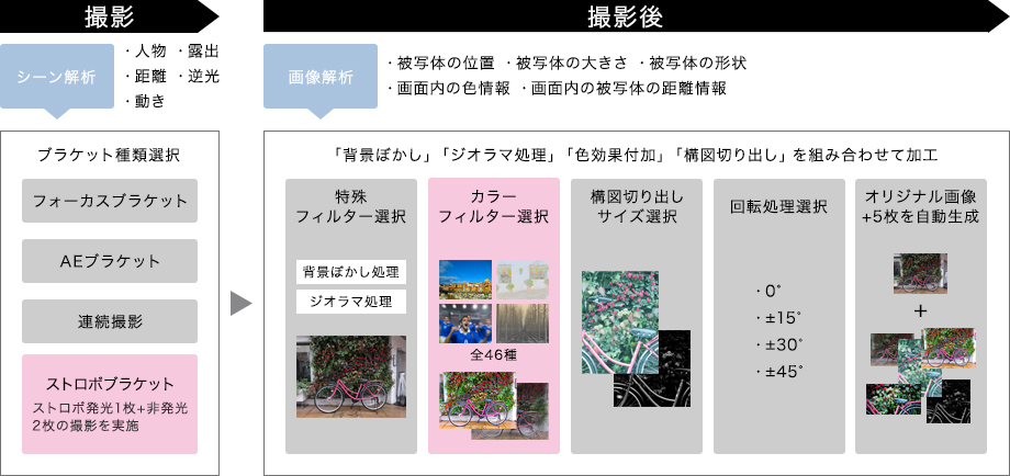シーン解析時のブラケット選択で、「ストロボブラケット」に対応。クリエイティブショットによる多彩な写真表現が可能です。