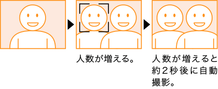 フレーム内に撮影者が加わり、人数が増えたことを判断してから人物にピント・露出を合わせ、約2秒後に自動的にシャッターが切られます。