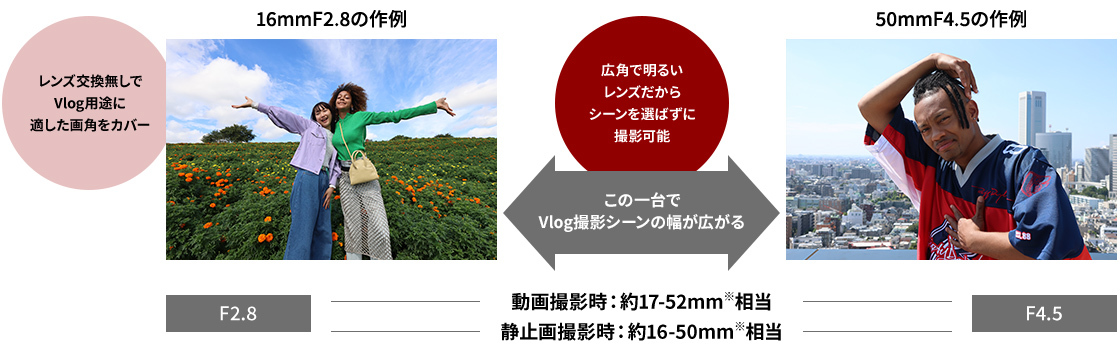 動画撮影時:約17-52mm※1相当、静止画撮影時:約16-50mm※1相当(8.2-25.6mm)/F2.8-4.5の明るいズームレンズだから、レンズ交換なしで幅広いシーンでの撮影を楽しめます。