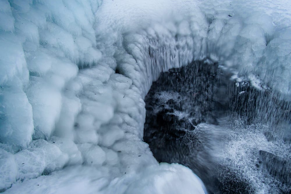 氷瀑の底 これは、双竜の滝の落下地点に立って