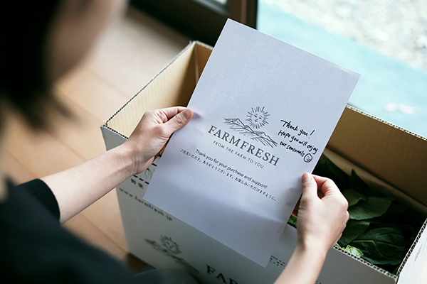 ECサイトのみの通信販売なので、箱には野菜リストと一緒にお手紙を添えて送るようにしています。こだわりを持った生産者さんの商品を取り扱うので、お手紙にはその生産者さんのこだわっているポイントや、美味しくいただくコツを記載しています。