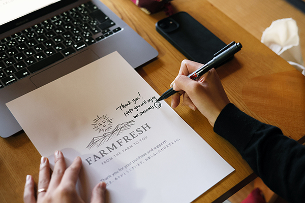 私にとって手紙とは、お客さまとの大切なコミュニケーションの場所です。ECサイト経由なので、お客様とコミュニケーションをとる場所は限られていますが、「魅力が伝わったから、より美味しく食べることができた」、「手紙で説明をしてくれたから、食べ方が分かった」などのお声をいただくと、続けていてよかったと感じます。