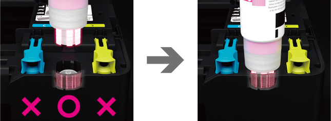 ボトル内に軽い空気を入れ、気体と液体を交換するカタチでインクを注入。タンクの空気口が液面に触れると自動で止まるので注ぎ過ぎの心配がありません。