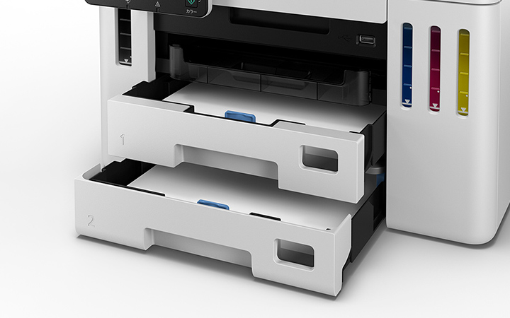 印刷停止時間削減特大容量インクタンクや大容量給紙、セルフメンテナンス仕様により印刷停止時間を極力削減。