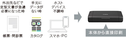 定型文書データが5つまで保存可能。顧客訪問時に営業ツールや帳票類などが必要になった時や、通信環境が整っていない場所での打ち合わせの時などに、本体から直接プリントできます。