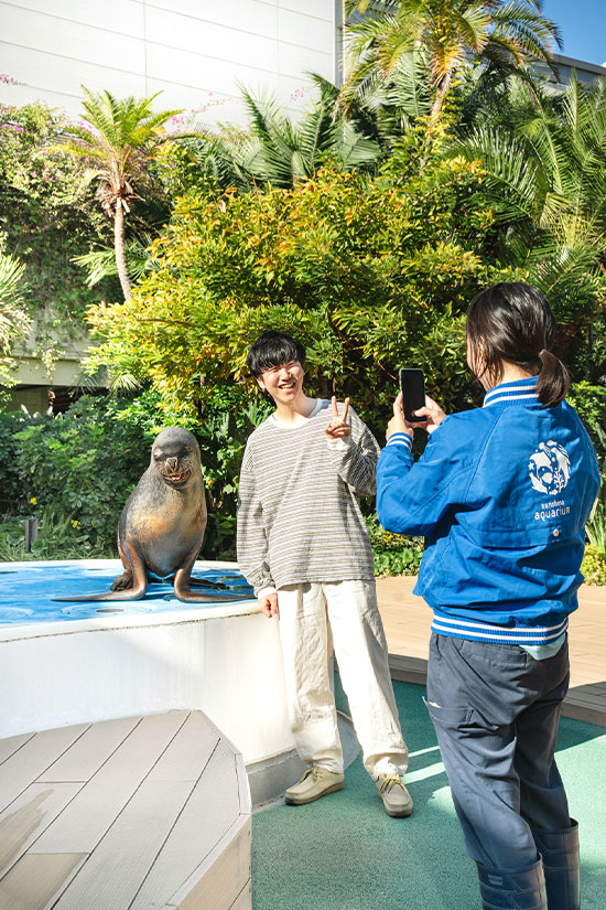 ▲アシカのボイストレーニングに協力してくれたお礼に、アシカとの2ショット写真をスタッフが撮影。