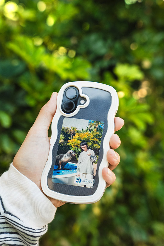 ▲カードサイズは、スマホケースに挟むステッカーにもベストなサイズ。右下に印刷されるよう水族館のロゴフレームも登録。