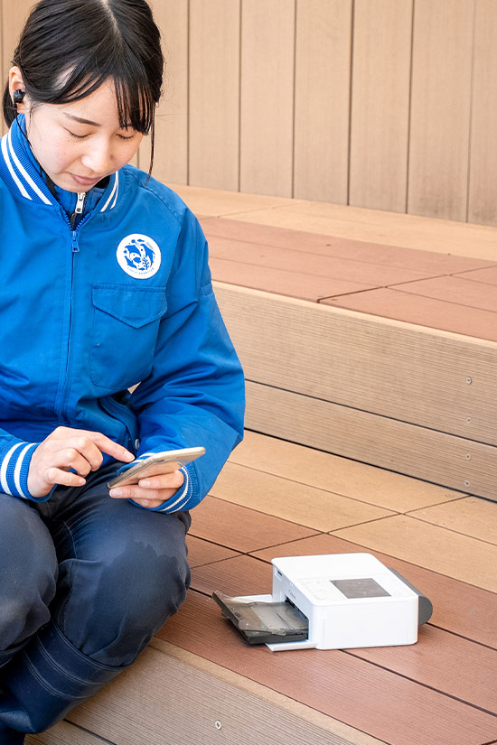 「当館はリピーターも多く、特にアシカエリアでは推しのアシカに会うために毎週のように通われる方も。SELPHY CP1500は、そんな来館者へのサービス向上のため大きな可能性を秘めていると思い、モニター参加に手を挙げました。まず行ったのは、アシカとの記念写真のプリントサービスです。当館では以前から、アシカのトレーニングの一環としてボイストレーニングをしています。飼育スタッフだけでなくどんな人の声にも反応できるよう、アシカトレーニング中にお客さまの中からおひとりにお声がけし、ご協力いただいています。そのお礼としてアシカとの2ショット写真を撮影、その場でカードサイズにプリントしてお渡しするサービスを行いました。SELPHY CP1500は外付けバッテリーを使えば、電源がない場所でも利用OK。パフォーマンスステージ周辺は水しぶきが飛ぶこともありますが、SELPHY CP1500でプリントした写真は水に強い特徴があるため安心です。カードサイズの写真はスマホケースに挟むステッカーにも使えて便利!どの水族館で撮った写真かすぐわかるよう、当館のロゴも入れました。プレゼントしたお客さまからはいい記念になると大好評です」(飼育スタッフ・有田蒔実子さん、以下同)
