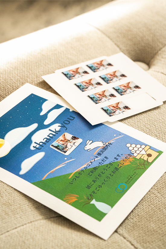 ロビーの写真をシールプリントし、サンキューカードに添えてお渡し