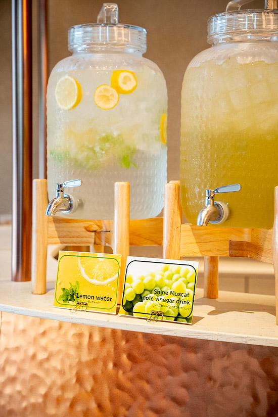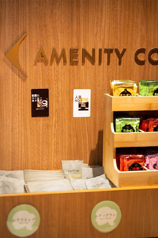 各宿泊フロアのエレベーターを降りるとアメニティコーナーがあり、ヘアブラシやヘアクリップなどのほか、種類豊富なティーバックやスープまで充実。また、大浴場前にはウエルカムドリンクが置かれ、レモンウォーターや旬のフルーツのビネガードリンクを自由にいただくことができます。そんなサービスコーナーの案内POPにも、SELPHY CP1500を活用しました。