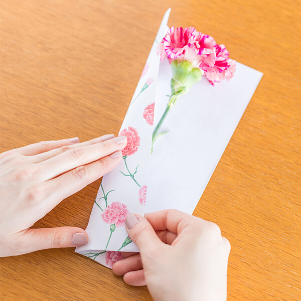 プリントした用紙を縦に置き、用紙中央に花を置きます。花の上部が隠れないように、用紙の上部に寄せて置くと良いでしょう。また、ラッピング前に花は保水をしておきましょう。用紙下部を折り返し、用紙の左右を重ね合わせて花をふんわりと包みます。