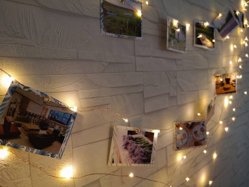 好きなデザインを印刷した紙に写真を貼り付け、穴を開けてガーランドのように吊るすだけです。