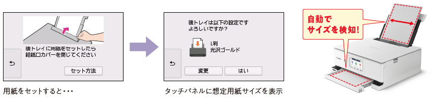 カセット・後トレイともに用紙をセットすると、センサーがサイズを検知し、それに応じた用紙サイズを設定画面に表示。選択操作が不要でプリントをスピーディーに行えます。