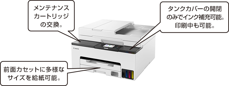 インクや用紙の補充、メンテナンスカートリッジの交換も前面からできます。
