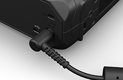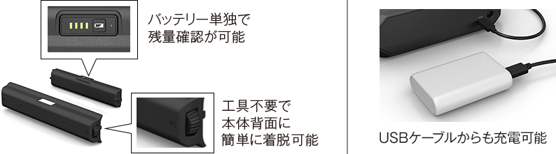 長時間の外出に便利な外付けのバッテリーをご⽤意。バッテリー単独で電池残量が確認できるので、急な電源切れを防ぐことができます。また本体電源OFF時、または液晶が点灯してないスリープ時にはUSBケーブルからも充電可能。モバイルバッテリーやノートPC、カーソケットなどから充電できます。
