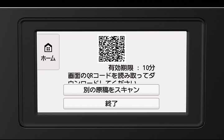 「スキャンしてスマホ保存」スキャン後にクラウドにアップロードされた画像をダウンロードするためのQRコードをプリンター本体に表示。スマホで読み取るとブラウザー上で画像/PDFが表示されます。