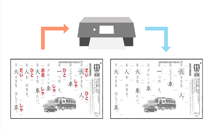 繰り返し学習などに便利な「カラー消去コピー」原稿のカラー部分だけを消去しブラック部分だけを残したコピーが可能。問題集や塗り絵などの繰り返し学習などに便利です。
